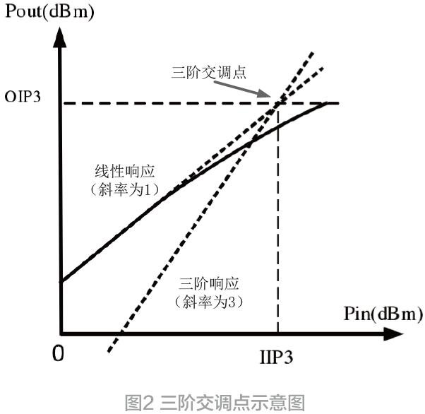 在式(3)的分量中可以存与频率ω1、ω2相关的频率分量。当ω1与ω2接近的情况下,2ω1-ω2和2ω2-ω1是与主信号频率(ω1、ω2)接近的两个信号频率[4]。因为过于接近,所以这两个新产生的交调量难以滤除。这一个三阶交调分量是对放大器性能的主要干扰,为了衡量这一个指标,采用输出三阶交调点(Output thirdorder Intercept Point, OIP3)指标来表示三阶交调分量对信号的干扰程度。图2 是三阶交调截止点的示意图,三阶交调信号线的斜率更大,随着输入功率的增加,它上升的更快。将两条线虚拟延伸,得到一个交点,此时的输出功率与三阶交调的输出功率相等,把这两根线条的交点叫做输出三阶交调截止点。