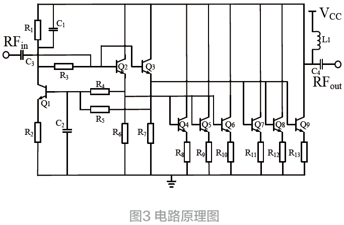 为了提高放大器的线性度,设计时在前文介绍的达林顿结构的基础上添加了偏置结构。晶体管Q1与电阻R1,R2,R3组成的偏置结构可以稳定电路的直流偏置点,提高电路的线性度。同时可以使得电路在高温和低温状态下的工作性能可以尽量与常温状态下保持一致。Q2与Q3,Q4~Q9晶体管组成达林顿结构。因为功率较高第二级晶体管上需要通过较大的电流,所以在设计当中采用了并联晶体管的方式,降低了每个晶体管上通过的电流,降低可能因为电流过大的产生的热效应,提高晶体管的耐功率裕度,并且并联结构可以降低电路的噪声系数。电阻R6~R13在晶体管的发射极连接到地电位,起到负反馈的作用[5]。电路基本结构原理图如图3 所示。