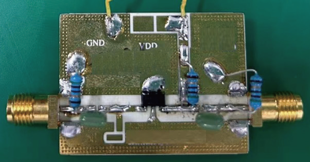 电路采用SOT89 塑封封装管壳,应用验证板如图4。测试条件为电源电压VCC=5 V。使用网络分析仪对电路进行三阶交调截止点等参数进行测试,三阶交调点测试曲线 MHz ~1 GHz 范围内,输出三阶交调点超过40 dBm。且能够保证功率增益达到20 dB,且增益曲线 dBm,电路在大功率输入情况下也拥有较好的线性度。测试结果表明实际测试与仿真结果基本一致,电路实现了高三阶交调点。说明本文中采用的以达林顿结构为基础,添加偏置结构对电路进行优化的方法可行有效。