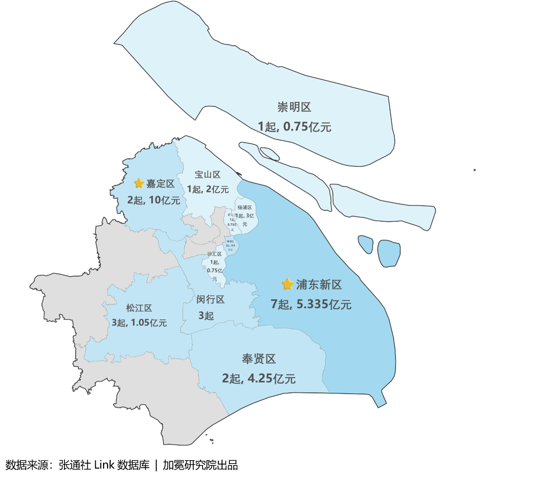 从行政区域分布来看,本周上海共有11个区发生融资事件。浦东新区融资事件数量最多,有7起,其次是闵行区和松江区,各发生3起。其余各区发生1-2起融资事件。其中嘉定区发生1起10亿元大额融资。