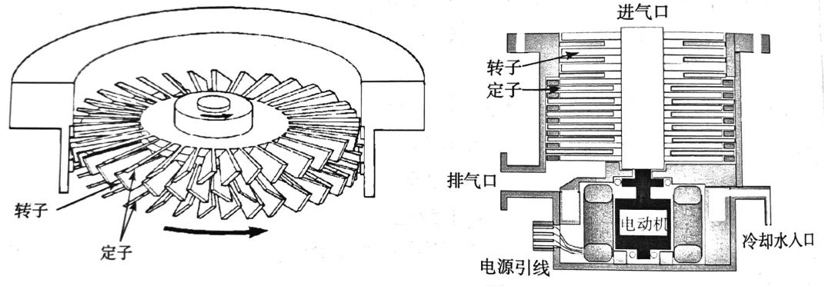 分子泵的抽气机理与机械泵靠泵腔容积变化进行抽气的机理不同。分子泵是基于动量传递原理,在变频电源驱动电机的带动下高速旋转,分子流区域内气体分子与高速转动的叶片表面碰撞,动量传递给气体分子,使部分气体分子产生定向流动而被排出泵外,从而达到抽气的目的。